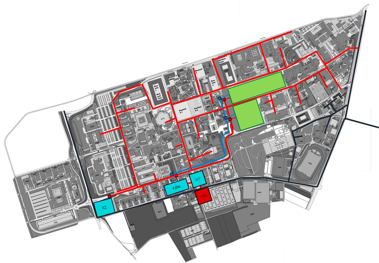 Die Johannes Gutenberg-Universität Mainz wächst – mit neuen Gebäuden für Pharmazie, Geowissenschaften, Medienforschung, Universitätsbibliothek. Parallel verändert sich die energetische Infrastruktur des Campus: Bestehende Nahwärme- und Nahkälteversorgung, eine neue zentrale Kältezentrale und ein Rechenzentrum mit max. 4 MW elektrischer Anschlussleistung bilden die Basis für eine Neuausrichtung der Wärme.